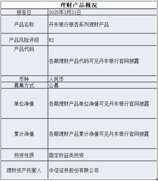 2025年一季度,我行理财产品稳定运行,现将“银杏理财”系列理财产品经营运行情况披露如下: