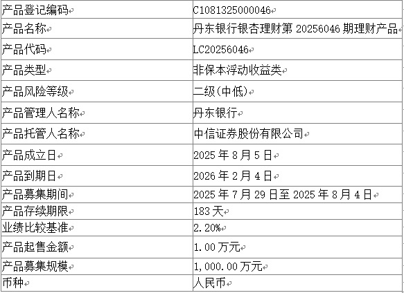我行发行的丹东银行银杏理财第20256046期理财产品已于2025年8月5日成立,根据与投资者的约定,现将理财产品成立情况进行信息披露,具体信息如下: