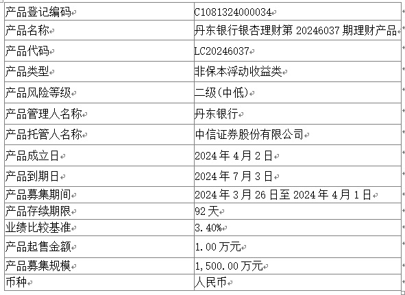 尊敬的客户: 我行发行的丹东银行银杏理财第20246037期理财产品已于2024年4月2日成立,根据与投资者的约定,现将理财产品成立情况进行信息披露,具体信息如下: