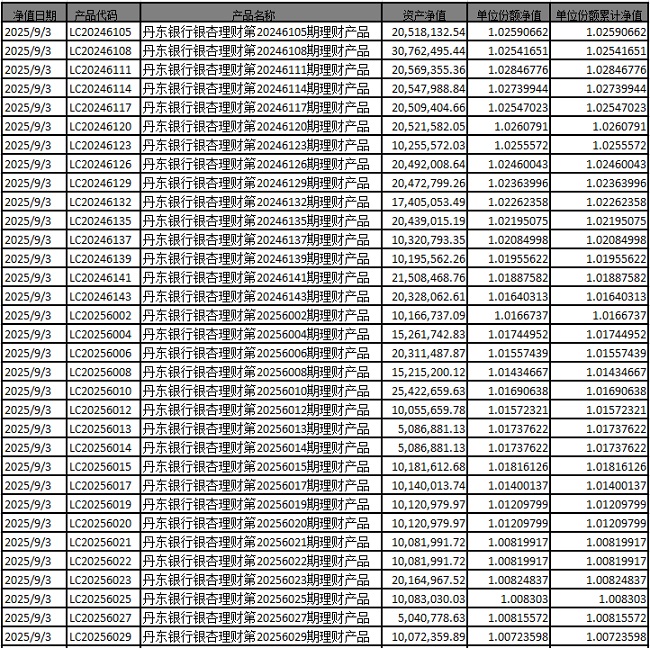 尊敬的投资者: 我行发行的以下理财产品资产净值与份额净值如下: